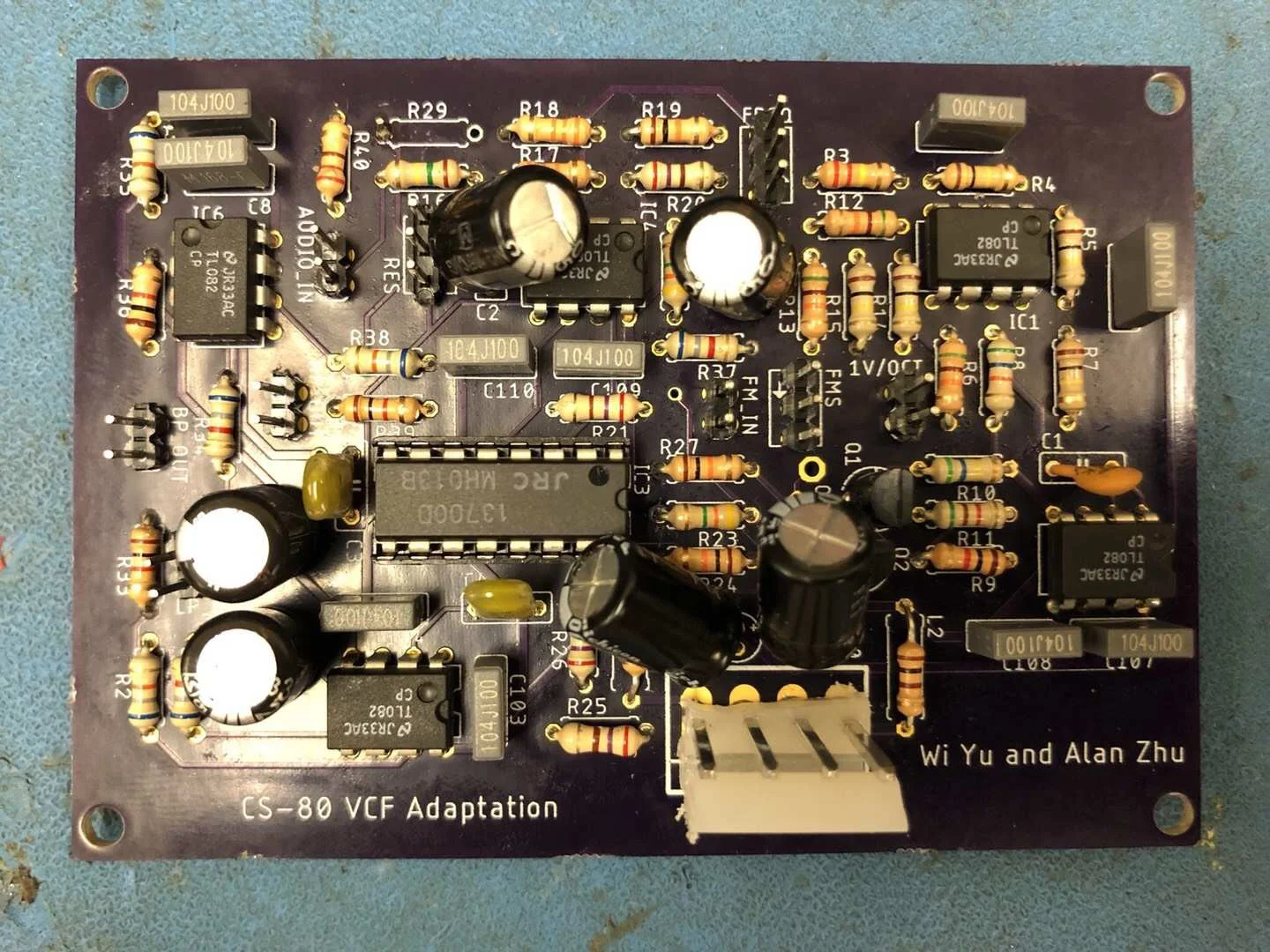 This project is a simple adaptation of the classical Yamaha CS-80 synthesizer. Here we focus on the Voltage Controller Filter section of the CS-80. The original CS-80 has two State Variable Filters, one outputting low pass filter signal and the other outputting bandpass and high pass signals. Since a State Variable Filter can generate low pass, bandpass and high pass signals at the same time, we choose to build only one State Variable Filter. We also made modification over the feedback path of the State Variable Filter. Originally the feedback is controlled by an OTA. Now we simplify it to a pure resistive feedback path. By increasing the potentiometer value, the feedback resistance will increase and thus reduce the feedback and increase the resonance amount (or Q). Current generating circuit is based on a BJT pair. All circuit design and layout are being done in Eagle.
